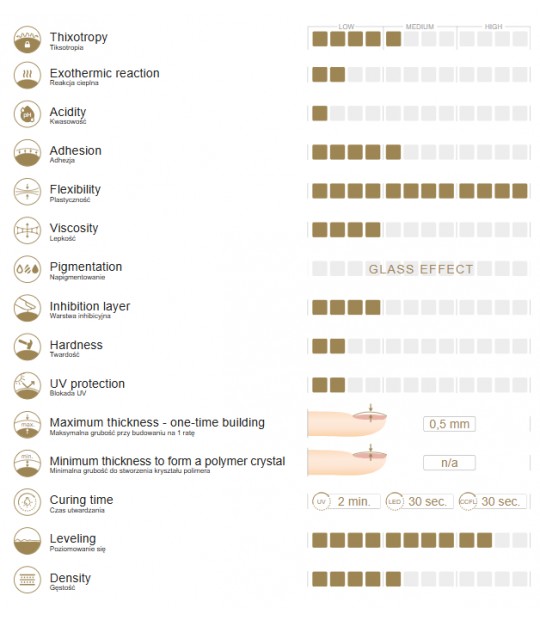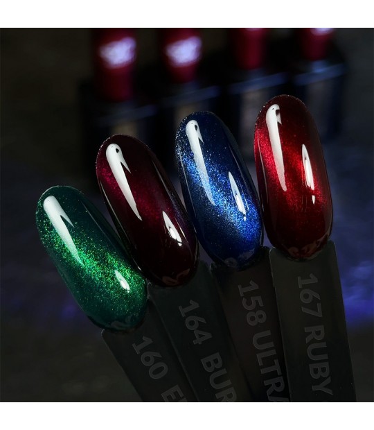 Hibridni lak 158 Ultramarine Glass je intenziven trajni lak, ki obenem, ko nohtu doda barvo, ohranja transparentnost. Zahvaljujoč steklenemu efektu permanentni lak zagotavlja nasičen in izrazen efekt a obenem je njegova uporaba hitra in učinkovita. Poleg tega kremasta, srednje gosta konsistenca laka bistveno olajša delo ter omogoča natančno nanašanje in enakomerno prekrivanje nohtne plošče, trajno lakirane ali izdelane iz gela oziroma akril gela. Ena pozitivna prednost barvnega laka za lakiranje je tudi sposobnost natančne uporabe in omogoča natančno nanašanje v predelu obnohtne kožice, ne da bi se ta razlil in kožice dotaknil. Na natančno nanašanje v predelu obnohtne kožice pa zmanjša vidnost narastka vse do naslednje korekcije nohtov. Lak lepo pokriva površino nohta že v tanjšem sloju, kar na nohtu ne ustvarja dodatne, nepotrebne debeline nohta.