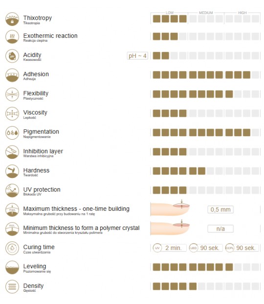 Pri gradnji nohta je priporočena debelina plasti največ 0,5 mm – a če je potreba, se nanašanje lahko ponovi. Čas polimerizacije je 90 sekund v LED lučki za nohte.