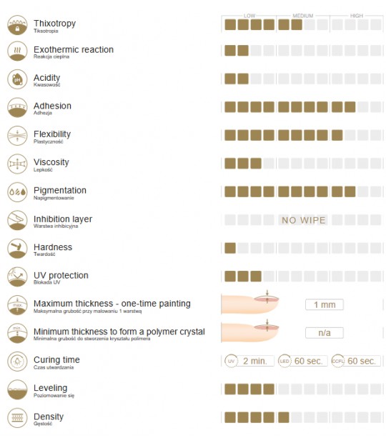 Polimizirajo se 120 sek v UV lučki in 30 sek LED lučki. Čas se podaljša, če se nanaša v debelejšem sloju, kot 3D nail art. Pri dodajanju pigmentov se čas utrjevanja podvoji.