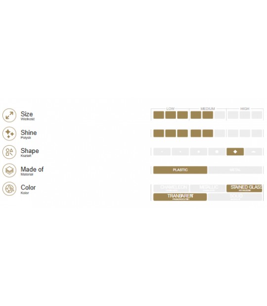 3D kristalčki Old Blood zagotavljajo obstojen, profesionalen rezultat in so odlična izbira za nohtne stilistke, ki želijo svojim kreacijam dodati sofisticiran in opazen poudarek. Srednje veliki kamenčki brez ravnega dna - ko bi imeli obliko piramide. Imajo lep, bleščeč odsev. Izdelani so iz plastike in so pol transparentne barve.