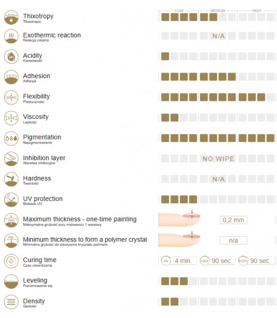 Gel je srednje tekoč. Ker je zelo pigmentiran, se nanaša v tankem sloje, saj se v nasprotnem primeru ne bi uspel posušiti v lučki za nohte.