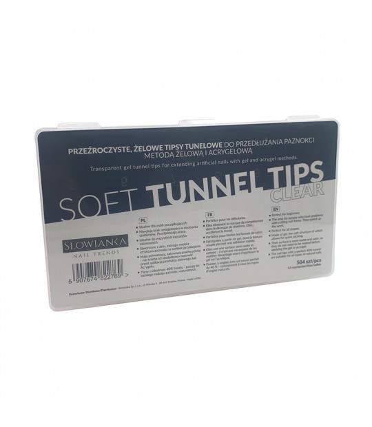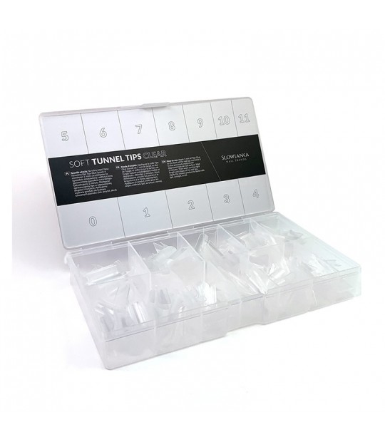 Soft Tunnel Tips CLEAR - prozorne umetne konice v 12 različnih velikostih so kot nalašč za začetnike odpraviti pomanjkanje veščin pri rezanju šablon, pospešiti delo, idealen za vse oblike. Narejene so iz gela, katerega mehka struktura omogoča hitro lepljenje. Ima pol mat satenasto površino - pred nanosom gela ali Acrygel izdelka jih ni treba dodatno matirati konice s popolnim 40% tunelom - primerne za vse vrste naravnih nohtov.
