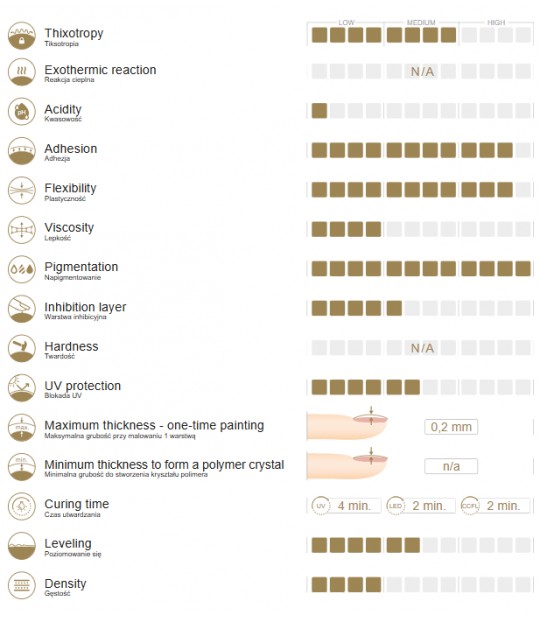 Gel je enostaven za nanašanje, kar je ključnega pomena za nohtne stiliste. Njegova tekoča konsistenca omogoča enostavno in enakomerno nanašanje, odlične samorazlivne lastnosti pa odpravljajo nevarnost neravnin. Intenzivna pigmentacija gela vam omogoča, da dobite intenzivno barvo brez nanosa več plasti, kar preprečuje pretirano debelino nohta v predelu prostega roba. Gel ima tudi subtilno viskozno plast, imenovano inhibicija, ki zagotavlja popolno povezavo z zaključnim topom, kar zagotavlja obstojnost in dolgotrajnost manikure.