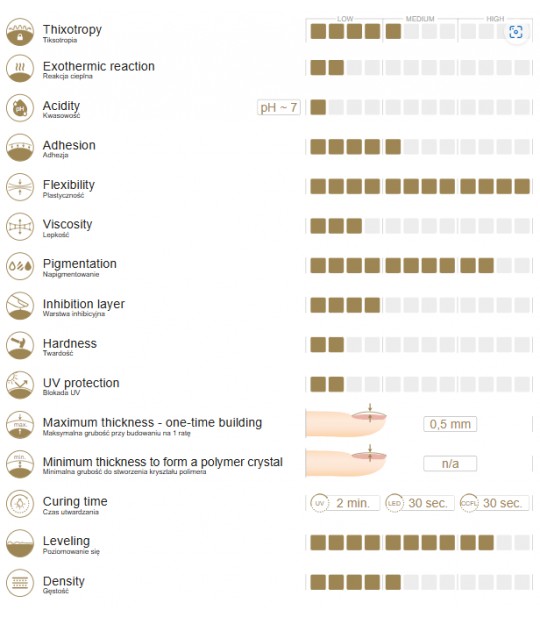 Kremasta, srednje gosta konsistenca, ki zelo olajša delo. Permanentni lak ne teče v predelu obnohtne kožice in omogoča lep nanos barve tik ob obnohtno kožico, zato narastek ni viden dolgo časa.
