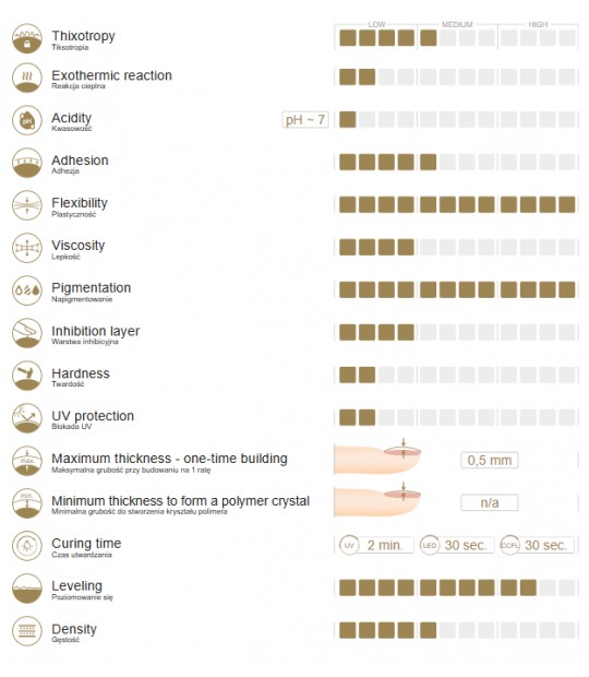 Kremasta konsistenca in srednja izravnava omogočata preprost in enakomeren nanos. Med nanosom se ne razliva, kar preprečuje iztekanje v obnohtno kožico in obnohtne kanale. So samoizravnalni, njhovo razporejanje je idealno in na nohtu ustvarijo enakomerno gladko površino brez madežev in lis. Kolekcija ima zelo stabilno konsistenco, zato se barve ne krušijo. Delo z njim pozimi ali poleti je podobno, torej temperatura zraka ne vpliva na konsistenco barve. Zato ne izgubi svojih lastnosti zaradi temperaturnih sprememb. Vsebuje močne pigmente, ki zagotavljajo popolno prekrivnost že po enem sloju. Takšna pigmentacija se pri pastelnih hibridnih lakih redko pojavi. Na ta način stranka in stilist prihranita dragoceni čas.