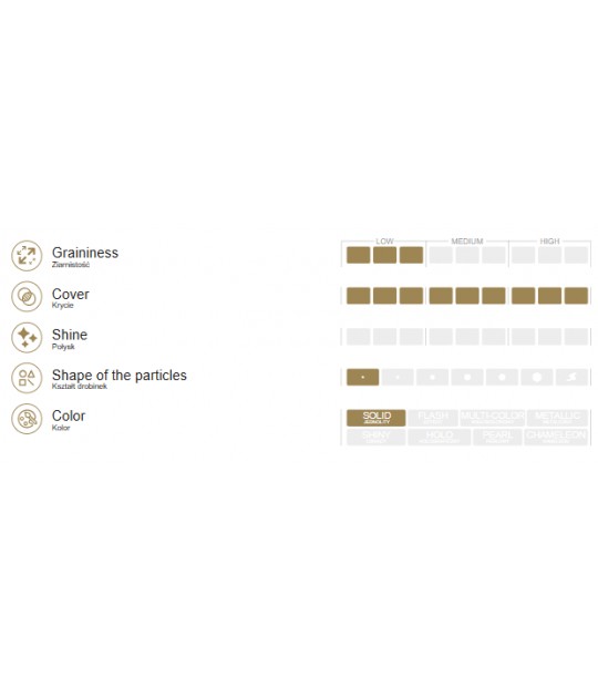 Zelo fino zmlet, visoko pigmentiran prah, namenjen nanašanju na nesušeno plast laka. Idealen za barvite, gladke barvne prehode brez neenotnih lis. Barvni prah je brez vonja in varen – njegovi delci ne plavajo v zraku, kar povečuje udobje pri delu. Nameščen v inovativni posodi z razpršilom v obliki spreja, zagotavlja natančno in priročno uporabo. Zahteva sušenje po nanosu in zaključevanje z izbranim topom.